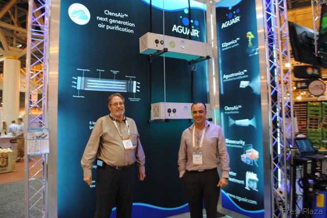 Kevin Youngberg y Valdemar Meza, en representación de Aguair con el producto Censair, que, según ellos, es la próxima generación de tecnología de desinfección del aire.