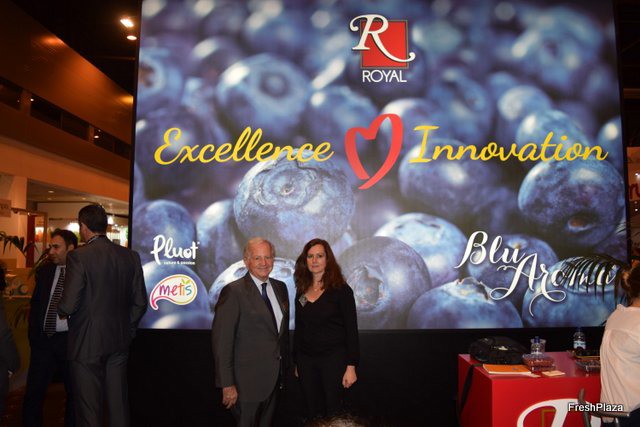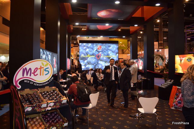 Stand de Royal, promocionando su próxima campaña de arándanos y la marca Metis para fruta de hueso.