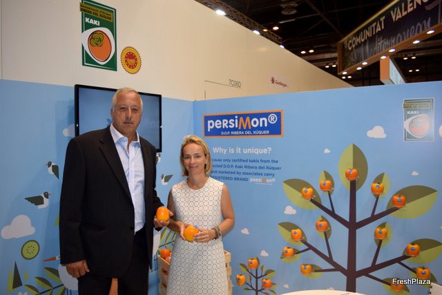 Stand de la DOP Kaki Ribera del Xúquer, con Gracia Teresí, de Frutas Alegre.