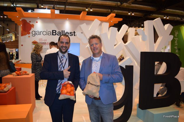 Jorge García Monfort, Director Adjunto de Garcia Ballester, con Ed van Venrooij, de Hoogvliet, presentando el nuevo envase para cítricos.