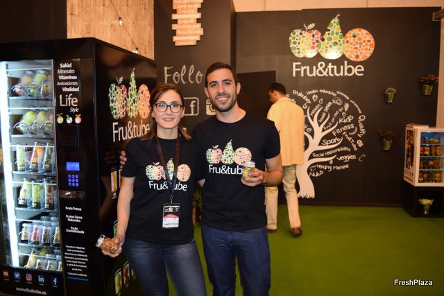 Carlos Mendez, con su mujer, en su stand de Fru&Tube, que ya está funcionando en máquinas vending en Madrid