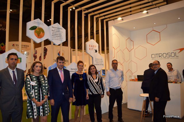Stand de Citrosol, presentando sus nuevas soluciones poscosecha, Citro Pyr, para el Control del podrido en cítricos y Citrosol Sunseal UE, una cera ideal para envíos de cítricos a ultramar. También han presentado el Easy Kit, para que los técnicos puedan hacer análisis de las frutas in Situ, a su envío y llegada de la fruta.
