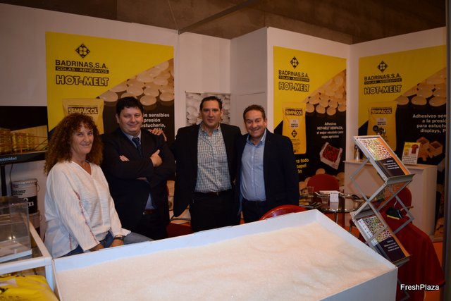 Susanna Giménez, Daniel Fernández, Francisco Vargas y José Antonio Bartolomé, en el stand de Badrinas, productores de colas y adhesivos para el sector hortofrutícola.