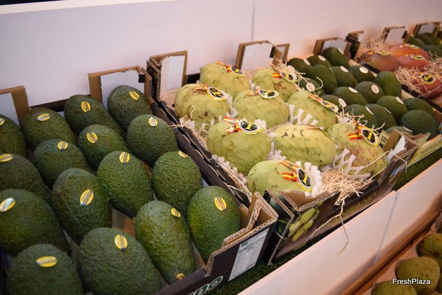 Chirimoyas, aguacates y mangos expuestos en el stand de Frutas Rafael Manzano, de Granada.
