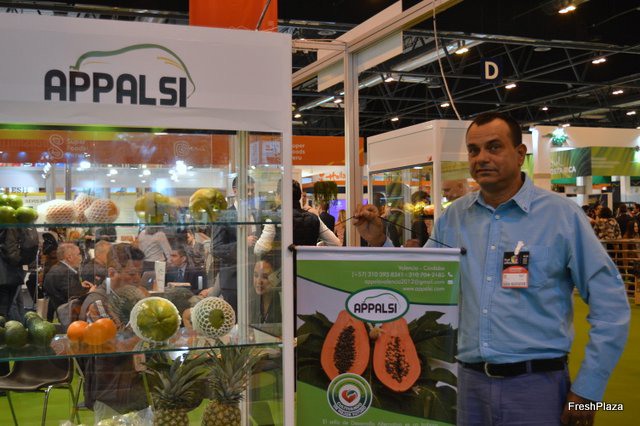 Stand de Sigfrido Fruits, con su gerente Sigfrido Molina en la derecha. Sigfrido suministra frutas tropicales todo el año.