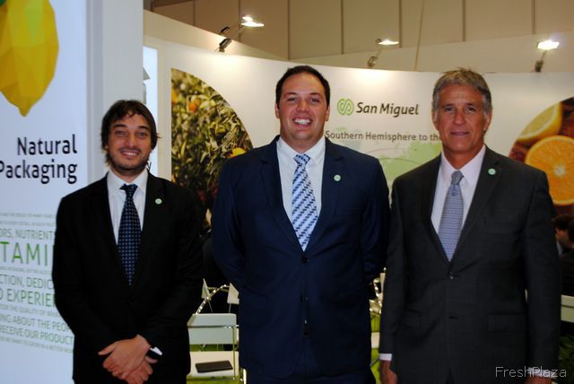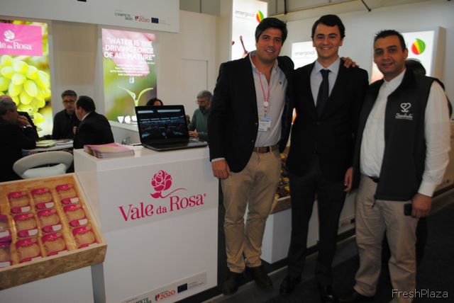 Enrique Silvestre Ferreira y José María Santa Bárbara, de Vale da Rosa, junto con Miguel Aquino Santos, de Frusantos. Ambas empresas son de Portugal.