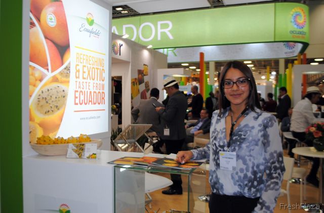 Evelyn Vallejo, de Ecuafields, Ecuador. En la feria no presentó solo su pitahaya amarilla, sino fruta exótica en general. Tiene interés en abrir el mercado europeo a sus exportaciones.