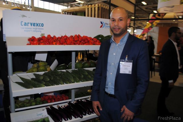 Serge Budhai, de Carvexco, en el pabellón de la República Dominicana. Es una empresa de exportación de hortalizas caribeñas.