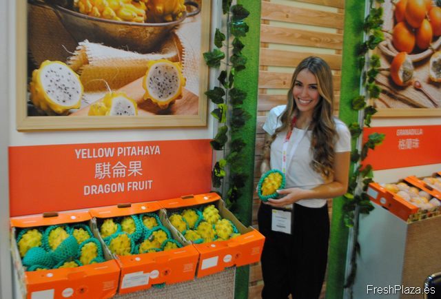 Daniela Manjarrés, de Ocati, promocionando su pitahaya amarilla. Ecuador espera abrir el mercado chino pronto para la exportación de pitahaya amarilla.