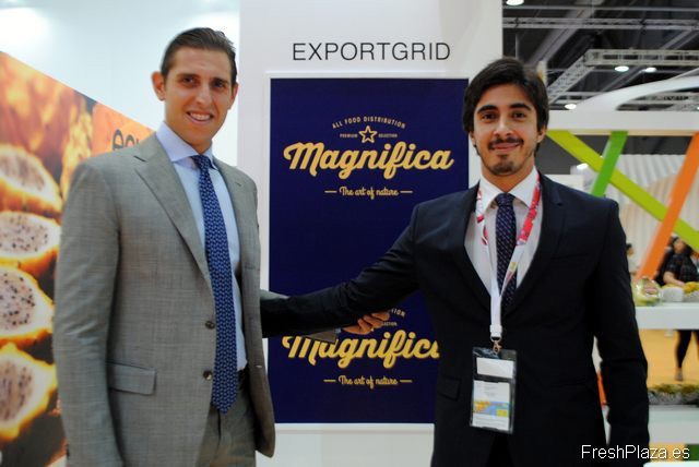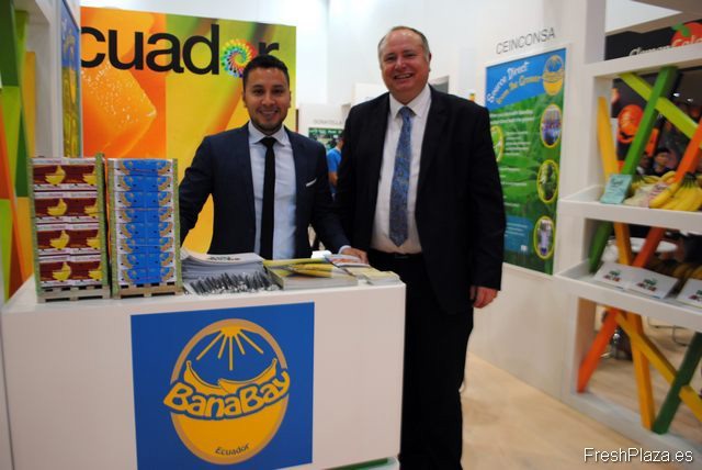 Rocco Scavetta y José Andrés Guerrero, de Green Force Fruit, Ecuador, promocionando la marca expuesta en la feria, Magnífica.