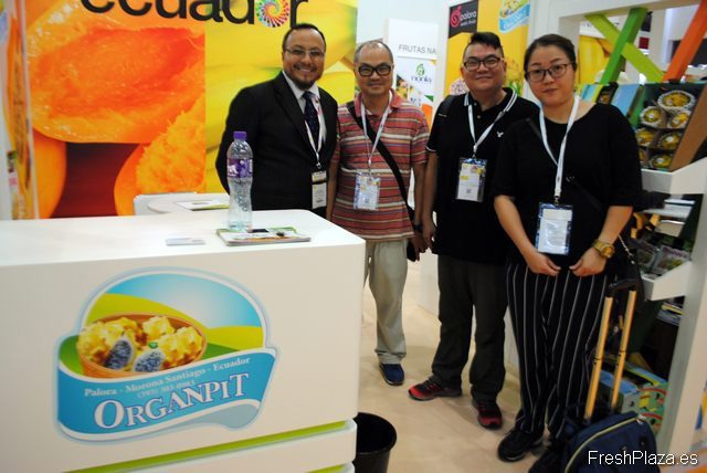 Xavier Mejía Román, de Organpit, Ecuador, con algunos de sus visitantes el primer día. Es otra empresa que exporta pitahaya amarilla y Xavier explica que estaría bien que el mercado chino abriera sus puertas.
