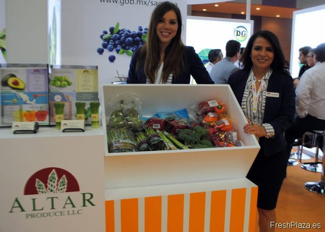 Evangelina Sánchez y Elizabeth Sandoval, de Altar Produce, en el pabellón mexicano presentando los diferentes productos de su surtido, como los espárragos verdes.