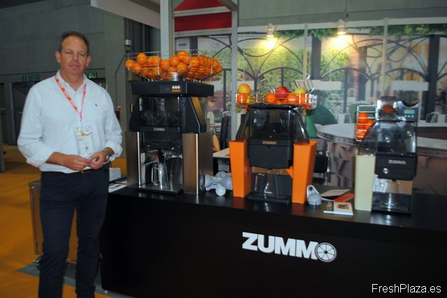 Pablo Bolinches, de Zummo, España, por primera vez en AFL, presentando sus máquinas exprimidoras.