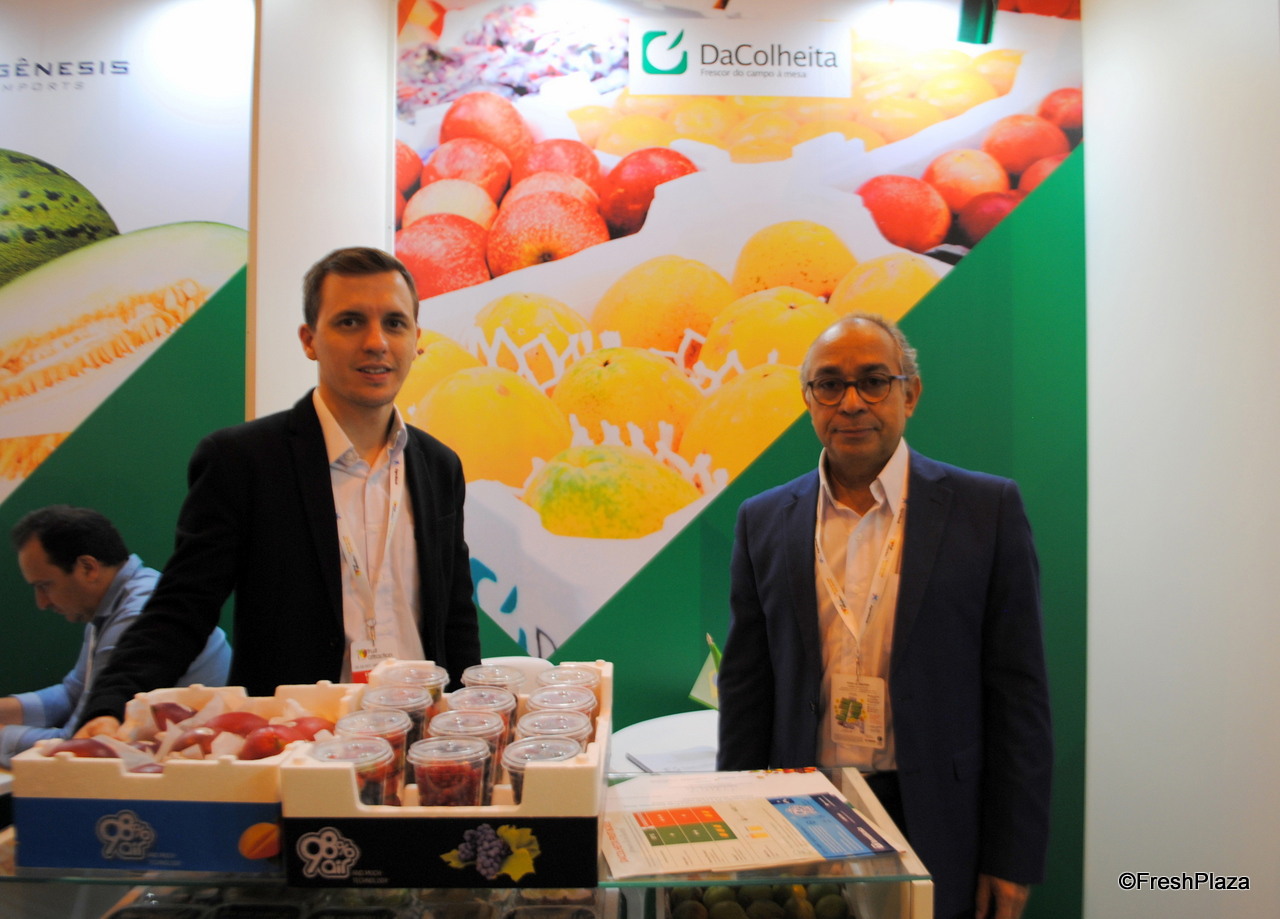 Tiago Pires y Alejandro Llao, de la nueva empresa Mercantis que conecta compradores con vendedores, visitando el stand de FreshPlaza.