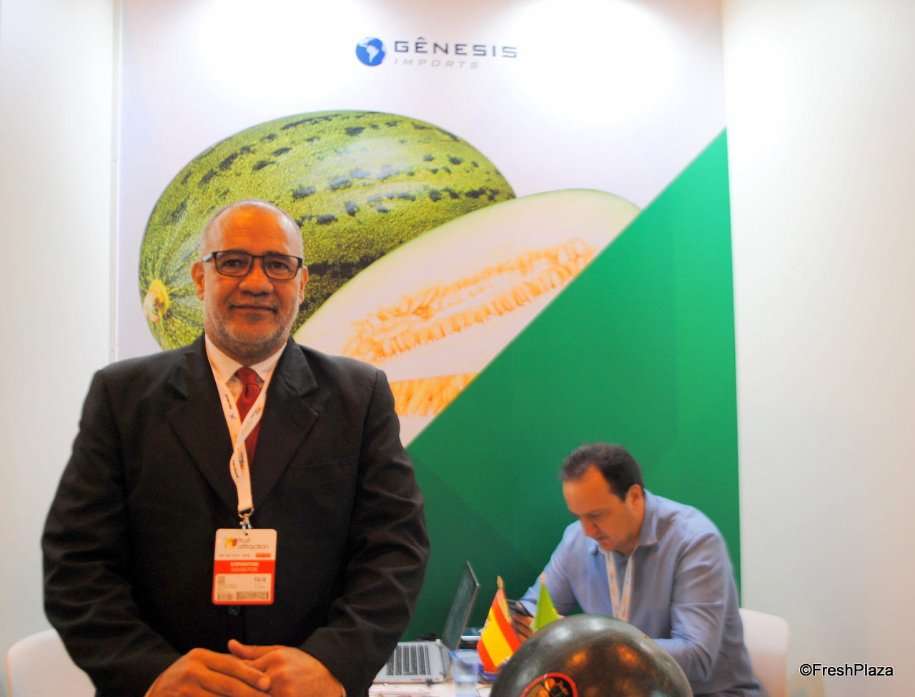Jordi Valle y Miquel Torradeflot, en el stand de Melón de Autor, promocionando la nueva campaña de melón de Brasil.  La empresa produce melón piel de sapo durante todo el año gracias a sus plantaciones en Brasil y en España con variedades premium.
