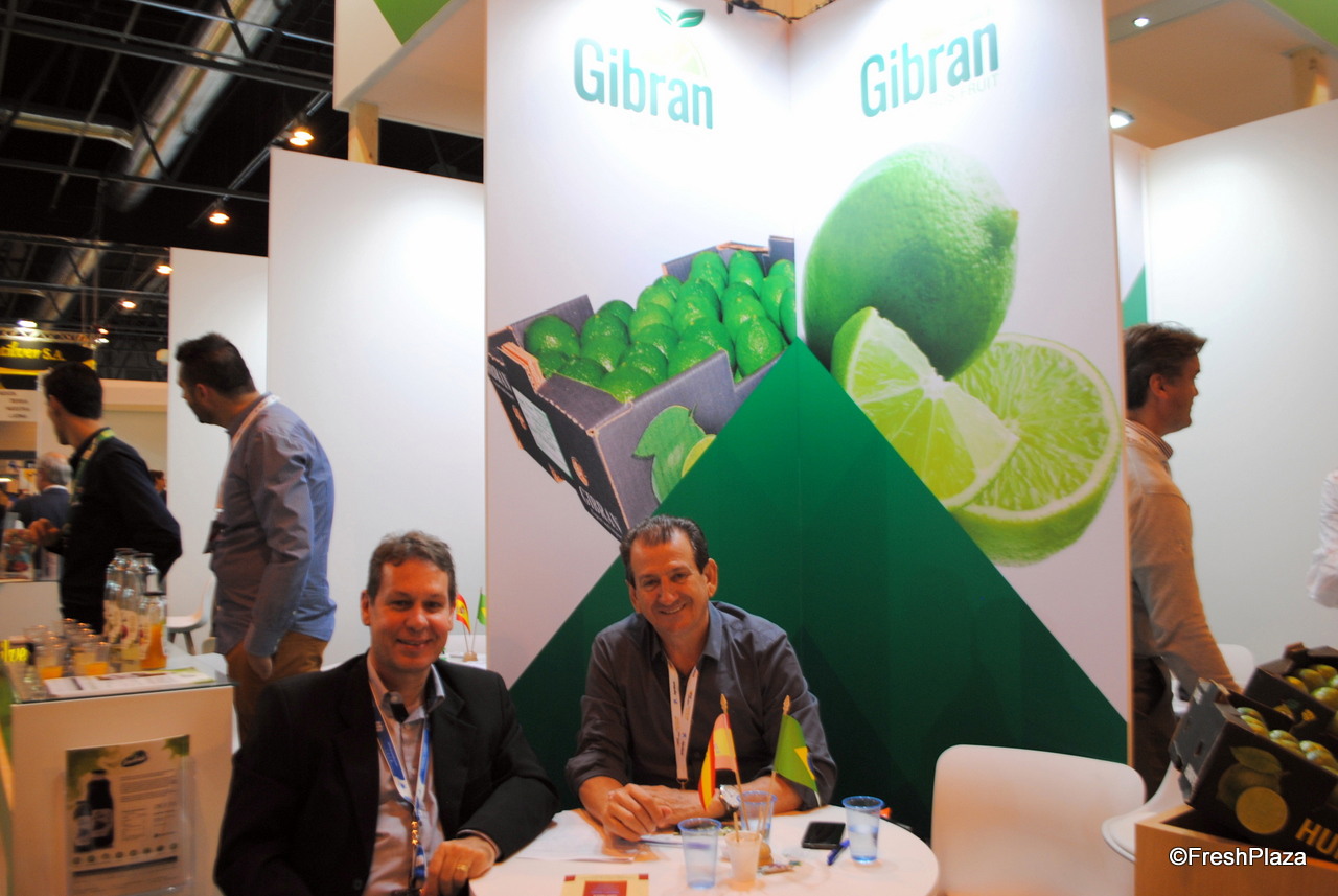 Luis Rangel, de la empresa brasileña Fermac, en el stand de Gibran Citrus Brasil, representada por Gilberto.