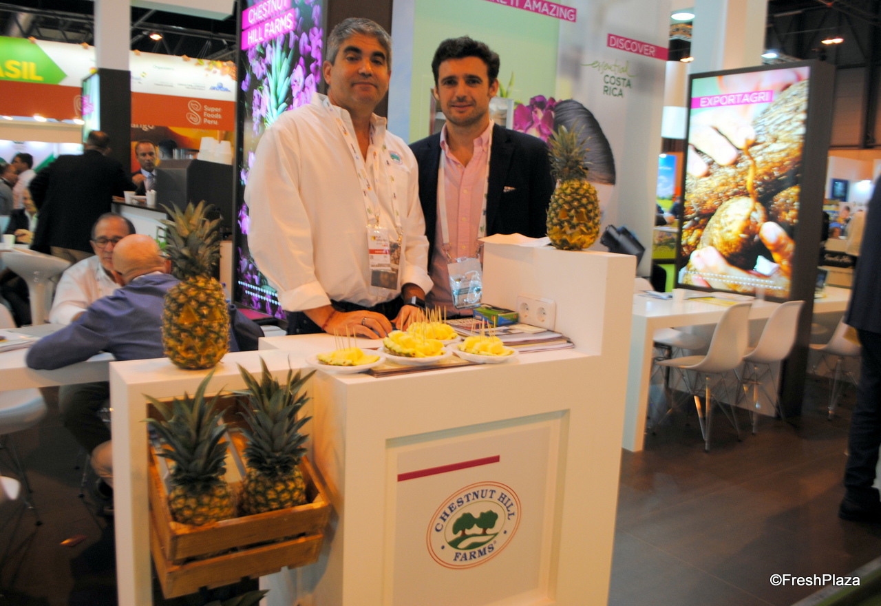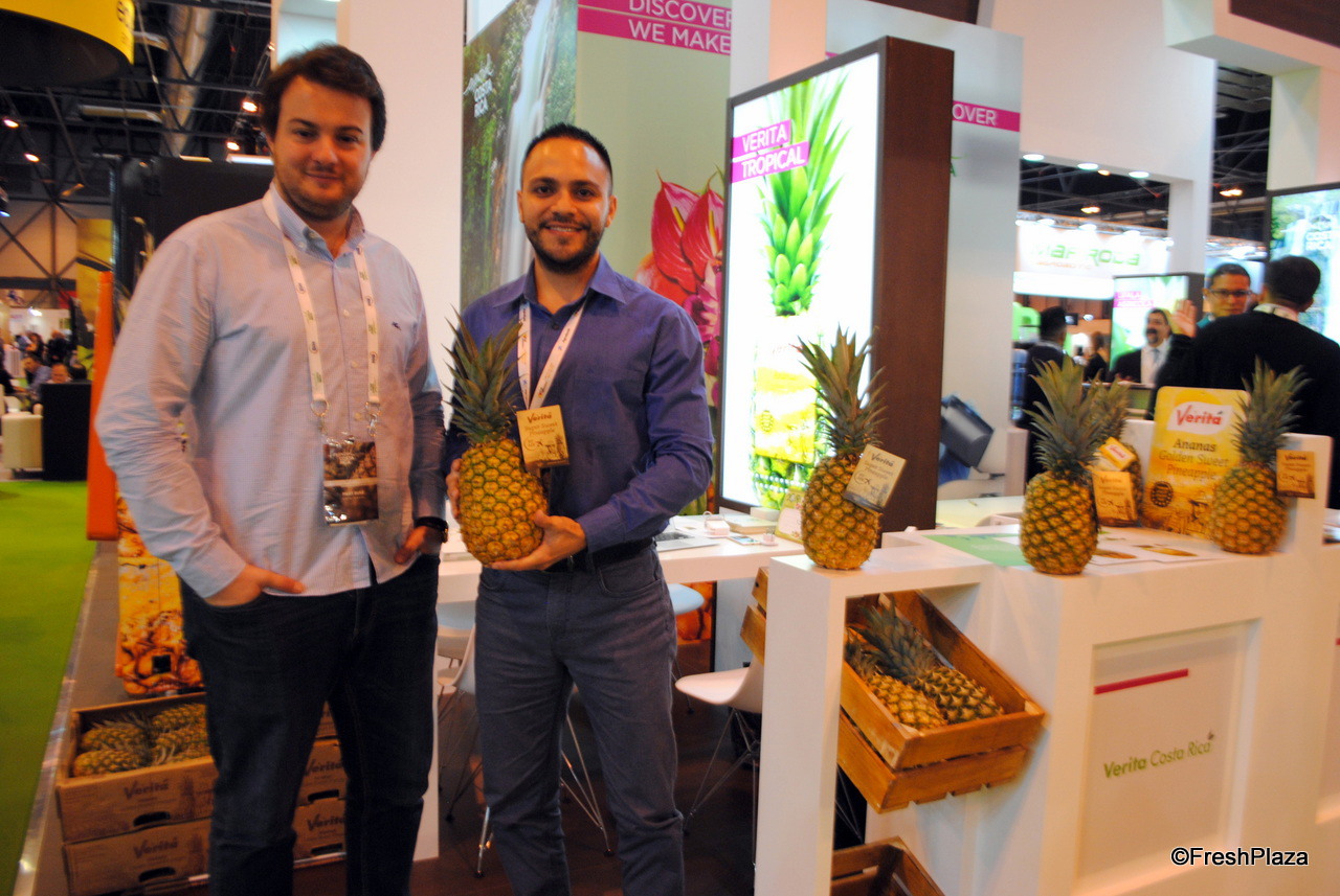 Mert Buke y Alonso Sánchez, de la empresa costarricense Verita promocionando su piña aérea.