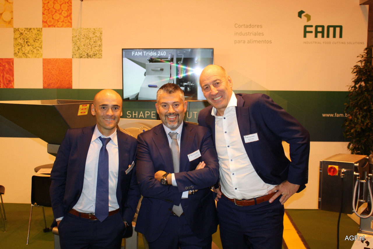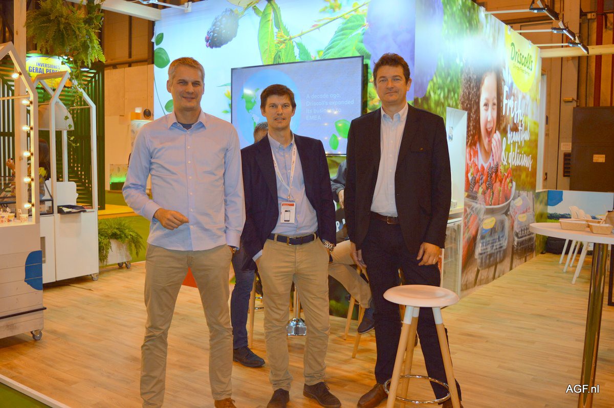 El holandés Stephan van Marrewijk director de marketing de Vicasol (izquierda), junto a Rob Langenberg y Corne Roks, de Fresh2You, visitando el stand de Vicasol.