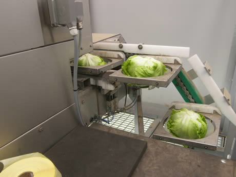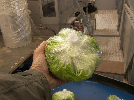 Cortadores de rodillas pueden cortar 600 a 650 cabezas por hora. En el pasado se trabajó con un sistema convencional. La lechuga Iceberg en una bolsa pequeña y cerrada con cinta adhesiva. Con 17 personas que podrían trabajar ocho paletas por hora en promedio. Con 480 cabezas por plataforma, esto significa alrededor de 225 cabezas por persona por hora.
