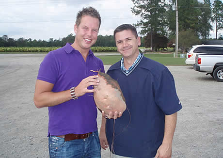 Dewey Scott y Edwin van Leeuwen, productores con una batata cosechada en uno de los campos. Esta patata pesa más de 5 kg.
