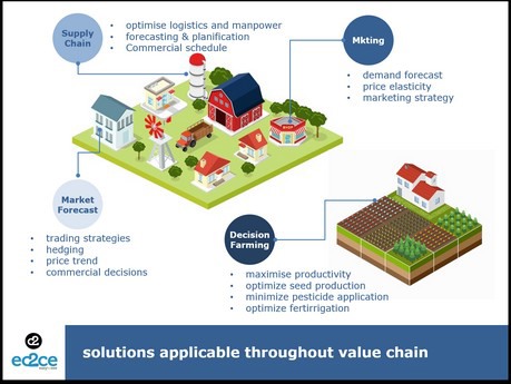 Las nuevas tecnologías se alían con el sector hortofrutícola para mejorar y facilitar la toma de decisiones. En concreto, la empresa española ec2ce se ha centrado en dos aspectos importantes de la cadena de suministro: la optimización de la productividad en invernaderos, mediante algoritmos de predicción a partir de datos como la irrigación, el manejo agrícola, la climatología, etc.; y la gestión de la estrategia comercial para comercializadores, a través de la predicción de acopios a una, dos y tres semanas vista utilizando datos históricos de entradas en la comercializadora, calibres, precios, y previsiones meteorológicas que marcan la producción disponible.