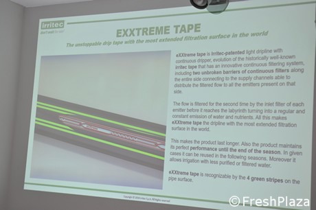 El fundador y presidente de Irritec, Carmelo Giuffrè, explicó: "El riego por goteo ganará cada vez más terreno, en especial en los países donde el agua es escasa. En muchos casos, la presencia de suspenciones como limo y arena fina no permiten la instalación de riego por goteo por el riesgo de rápida obstrucción de los goteros. Tras años de investigación, por fin hemos dado con una solución que hemos llamado Exxtreme Tape".
