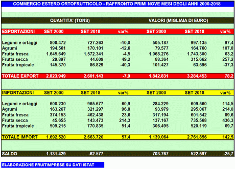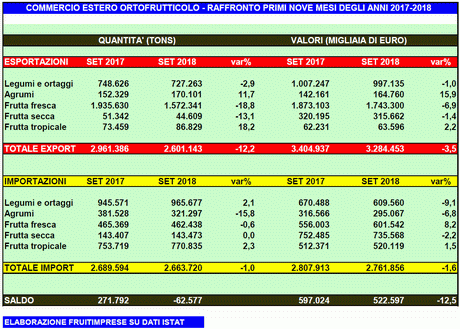 Fruitimprese ha compartido los datos referentes a los nueve primeros meses del comercio exterior hortofrutícola de Italia. Tanto la exportación (-12,2% en volumen y -3.5% en valor) como la importación (-1% en volumen y -1,6% en valor) han caído. El balance económico es positivo (522 millones de euros -12,5% en comparación con septiembre de 2017), mientras que el volumen es negativo (62.577 toneladas).