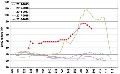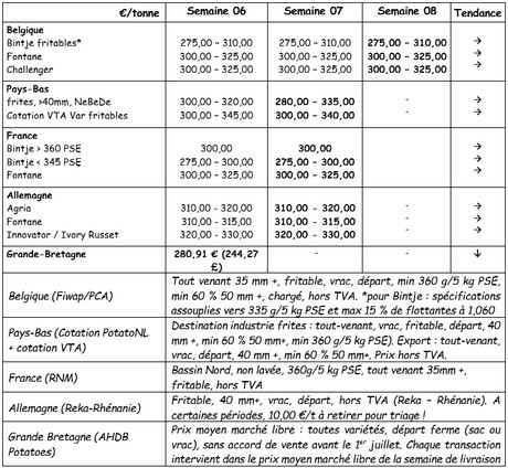 Industria: mercados que se mantienen estables, sobre la base de 30,00 €/q para las variedades clásicas y 33,00 €/q para las variedades/mercados más particulares. Exportaciones: más dinámicas, en particular hacia los países del este (y España + Italia). La demanda de patatas aptas para freír calibradas tiende a aumentar. Portugal también sigue siendo comprador, pero a duras penas sigue los precios de 30,00 €/q al productor. Los precios al productor varían de 30 a 35 €/q en las variedades de base lavables, y 40 - 45 €/q para las variedades de pulpa firme de calidad superior. Las reservas se han calificado como débiles en múltiples subregiones.