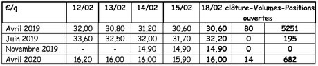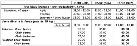 En el mercado de productos frescos (Renania), el 15 de febrero, precios en alza para las patatas de pulpa firme a 40 €/q de cámaras frigoríficas, y las patatas de pulpa tierna a 38 €/q de cámaras frigoríficas. Para las de pulpa firme en venta en la explotación (Renania) los precios varían entre 11,00 y 12,00 € por saco de 25 kg (sin cambios).