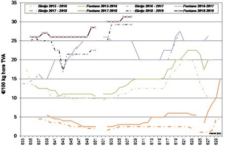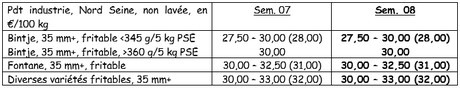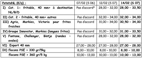 Bintje: "para freír": máx. 15% fluctuante a 1.060 g/l y PSE mín. de 335 g/5 kg: De 27,50 a 31,00 €/q en función de la calidad (PSE, cocción…), del calibre y del comprador. Precios más altos para los mejores lotes y de muy buena calidad, principalmente para patatas fritas.