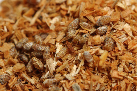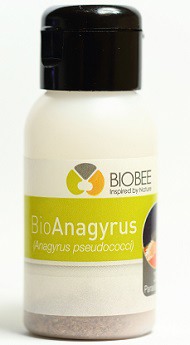 Pupas de la avispa parásita Anagyrus pseudococci mezcladas con serrín, ofrecidas por BioBee como agente biológico BioAnagyrus contra la cochinilla algodonosa.