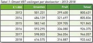 Tabla 1. Volumen de ventas de las subastas VBT por subsector – 2013-2018 (hortalizas - frutas - total)