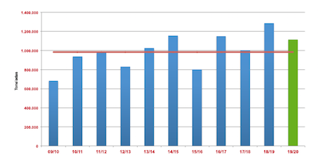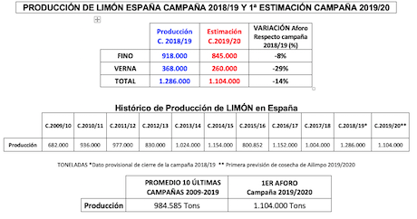 La primera estimación de cosecha (preaforo) de limón de AILIMPO para la próxima campaña 2019/2020, prevé una producción en España de 1.104.000 toneladas, lo que supone un descenso global del 14% en comparación con la campaña 2018/2019 en la que se alcanzó récord de producción. En el caso de limón fino la reducción de cosecha se estima en un 8%, y en el caso de Verna el descenso se estima en un 29%. Esta primera estimación de cosecha será confirmada en función de la disponibilidad de agua en verano y las lluvias de otoño.