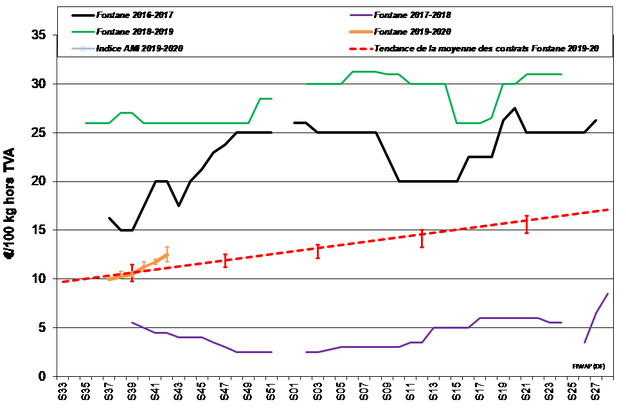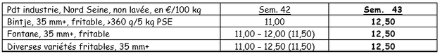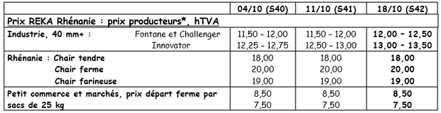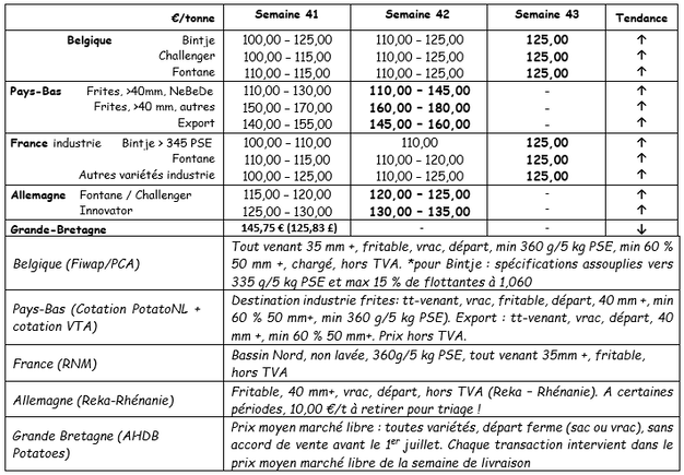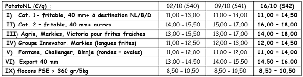 Numerosas fábricas compran en el mercado libre. La prioridad por ahora es continuar con las recogidas para almacenar, ya que las condiciones meteorológicas lo permiten, según las zonas de producción. La oferta por el momento está poco presente, con una tendencia al alza sobre los precios, sobre todo en la exportación, donde se acelera la actividad. Italia y España buscan patatas de calidad, debido a una degradación de la calidad de la oferta local. Los precios varían en una amplia franja, de 18 a 27 €/q (calibrado en grandes sacos para exportar). Los lotes de calidad tienen influencia sobre los precios en aumento en un mercado donde los precios están muy contrastados según las variedades trabajadas y la calidad ofrecida. El mercado interior es aleatorio, pero en general está poco activo, a pesar de un ligero descenso de las temperaturas. Solamente alguna operación comercial llevada a cabo por determinadas marcas anima el mercado.