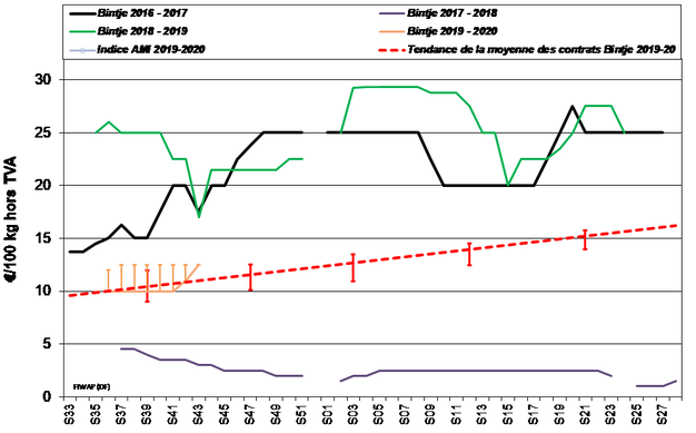 EEX en Leipzig (€/q) Bintje, Agria y variedades relacionadas con la trasformación, 40 mm+, mín. 60 % 50 mm +: