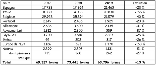 Las exportaciones arrancan de forma calmada: Francia ha exportado 63.800 toneladas el pasado mes de agosto, cerca de 10.000 toneladas menos que el año pasado. La sequía ha retrasado la disponibilidad de las cosechas. Bélgica ha reducido mucho sus importaciones de patatas francesas (solo 21.600 toneladas frente a las 36.000 toneladas del año pasado). Por otra parte, el comercio hacia España e Italia ha comenzado bien con el volumen más elevado desde 2015.