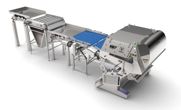 El sistema integrado combina las agitadoras Iso-Flo® de Key, una clasificadora por calibres rotativa y una clasificadora digital VERYX® para separar el producto entrante en cuatro flujos. Dos flujos van a residuos y dos flujos de aceptación continúan con el procesamiento. Uno de los flujos de aceptación se destina a las judías verdes difíciles de despuntar, que siguen su curso hasta equipos optimizados para el despunte. El otro flujo de aceptación toma las judías que se han despuntado en el campo y son fáciles de despuntar, y las lleva a otros sistemas diseñados expresamente para hacerse cargo de estas judías.