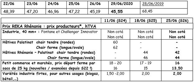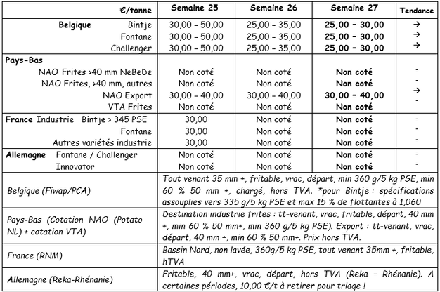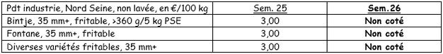Las condiciones más propicias para el crecimiento (vuelta de las lluvias, aunque insuficientes todavía en algunas subregiones) han calmado los mercados la semana pasada. Algunos compradores siguen estando presentes, para patatas fritas, pero también para chips y copos. Sin cotizaciones (final de temporada).