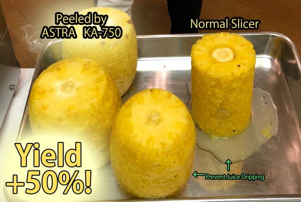 "Pese a que ha habido ligeras fluctuaciones en nuestras cifras de negocios, todavía tenemos muchas esperanzas puestas en el futuro. Hoy en día, los consumidores prestan más atención a la higiene de la fruta. La fruta menos manipulada por los trabajadores es más segura de consumir. Además, si se pela con una máquina, permanece fresca más tiempo. La máquina también evita el cambio de color y la pérdida de jugo, lo que genera menos desperdicios", explica Takeshita. "Por ejemplo, la unidad KA-750 puede pelar más de 200 piñas por hora. En comparación con un cilindro normal, esta máquina produce un tercio menos de desperdicios. Digamos que, si la empresa produce 100 kilos de piña cortada al día, el ahorro de costes sería de 50.000 dólares al año".