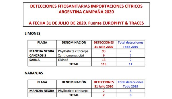 La prohibición de exportar limones a la UE que Argentina se impuso a sí misma el 1 de julio, no ha tenido el efecto deseado, habiéndose interceptado lotes de naranja con Mancha Negra en las últimas semanas. A partir de esta nueva prohibición vigente desde el 16 de agosto, la UE realizará una auditoría del sistema de garantía fitosanitaria para el cultivo de cítricos en Argentina a principios de 2021. Dependiendo del resultado, la UE podría decidir cambiar la fecha de finalización de la prohibición.
