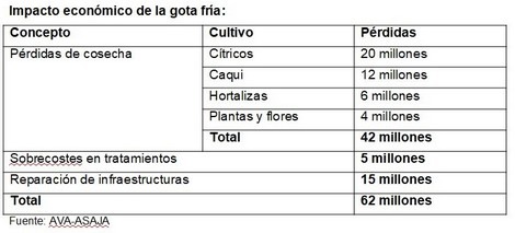 La histórica gota fría que descargó ayer en la Comunitat Valenciana, especialmente en las comarcas litorales, ha provocado más de 62 millones de euros tanto en pérdidas de cosechas como en sobrecostes de tratamientos para salvar el arbolado y en reparaciones de las infraestructuras agrarias dañadas, según una primera valoración avanzada por la Asociación Valenciana de Agricultores (AVA-ASAJA).