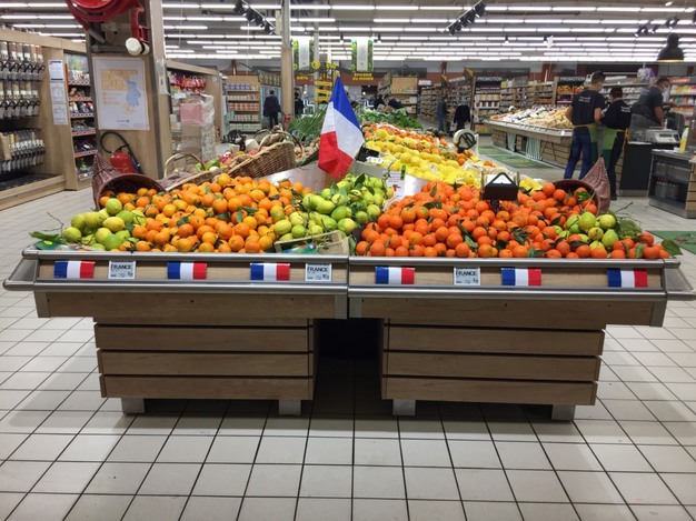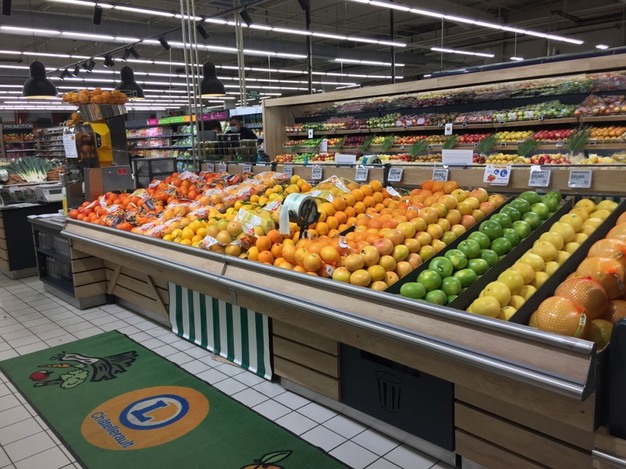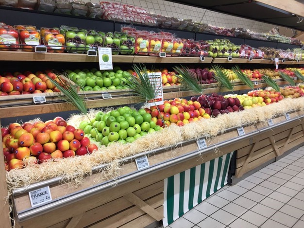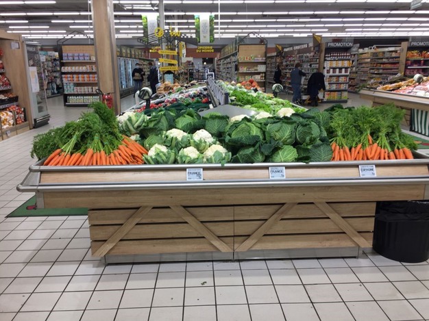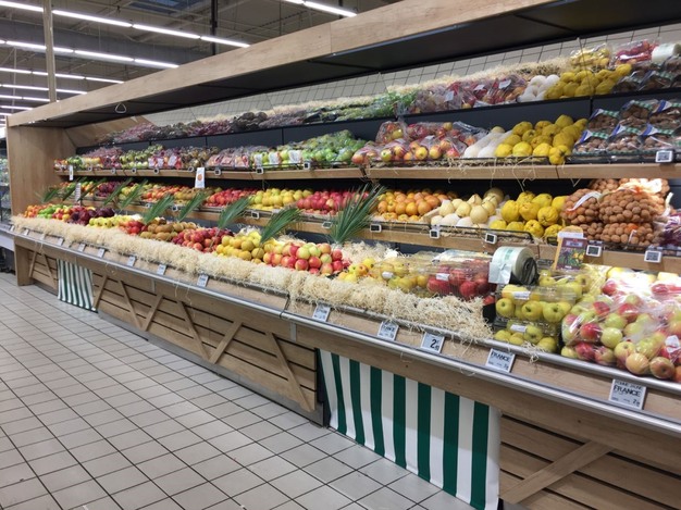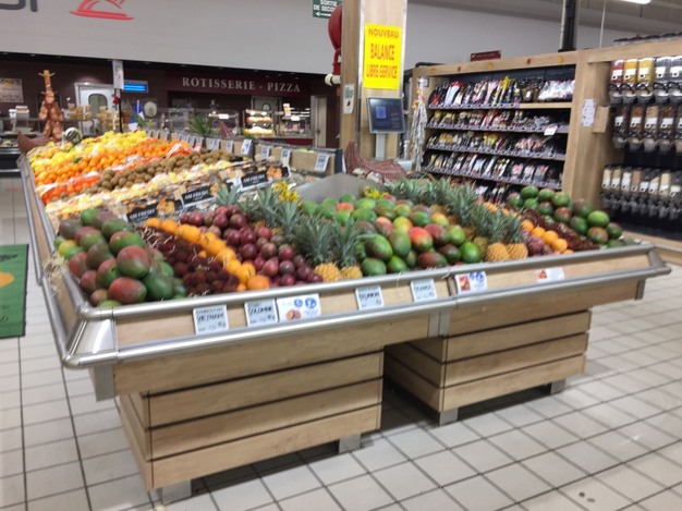 La sección de frutas y verduras del hipermercado está compuesta por dos grandes islas, 2 islas de talla mediana y un expositor mural. "Mi clientela encuentra una gran selección de frutas y verduras de temporada, que se venden a granel, en bandeja o incluso en mallas. A esto se añaden las frutas y verduras tradicionales, un estante exótico (frutas y verduras), uno reservado a las frutas y verduras ecológicas (también con productos locales, de ser posible), un estante de frutos secos (bolsas y tolvas), un refrigerador para productos de cuarta gama, un refrigerador para productos frescos y cortados y un mural con ajos, cebollas, chalotas y patatas en mallas".