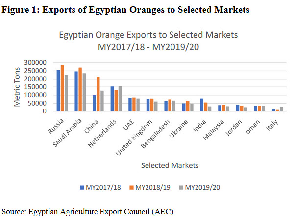 Para la temporada 2020/21, FAS Cairo estima que la exportación de naranjas egipcias aumentará a 1,50 millones de toneladas, frente a los 1,37 millones de toneladas de 2019/20, gracias a las condiciones meteorológicas favorables. Arabia Saudita, Rusia, los Países Bajos, China y los Emiratos Árabes Unidos probablemente seguirán siendo los principales destinos. Nueva Zelanda, Japón y Brasil se incluyen entre los nuevos destinos de exportación para las naranjas egipcias. En 2019/20, se exportaron 343.000 toneladas menos en comparación con la temporada anterior. La pandemia de COVID-19 se ha identificado como la causa principal de esta disminución.