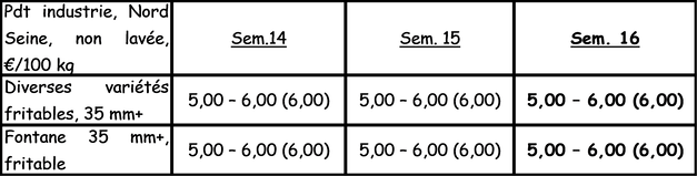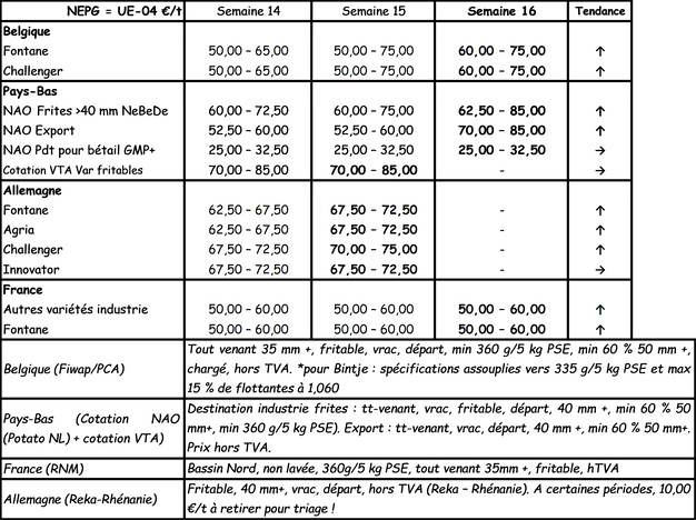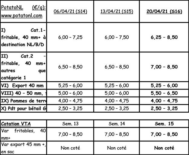 Para la industria: los compradores presentes son más activos, pero sin evolución de los precios por el momento. El comercio con intermediario sigue realizando compras igualmente. Las cotizaciones son de estables al alza. Los contratos siguen entregándose en el plazo estipulado. Los mercados de productos frescos son bastante dinámicos, con algunas variedades, como Agria, especialmente demandadas. Continúa la exportación hacia diversos destinos (países del Este, Italia, España, Portugal).