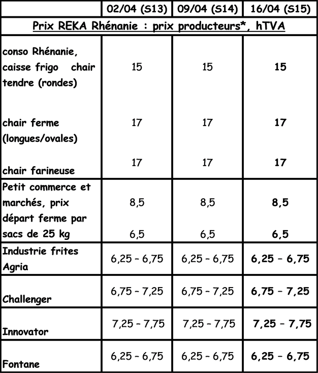 El mercado de productos frescos es más firme y los precios suben ligeramente. Mercado de productos frescos (precoces y semiprecoces): los precios de las patatas con pulpa firme a 11,00 €/q (10,83 €/q antes de la última cotización), y sin cambios para las de pulpa tierna/harinosa a 10,42 €/q (10,25 €/q antes de la última cotización). Sin embargo, para la mercancía procedente de almacenamiento en frigoríficos, es 3 € mayor (ver precios REKA en la tabla). Gracias al tiempo invernal (y al hecho de que los espárragos no crecen mucho), los consumidores están descuidando un poco las precoces importadas y siguen comprando las patatas viejas.