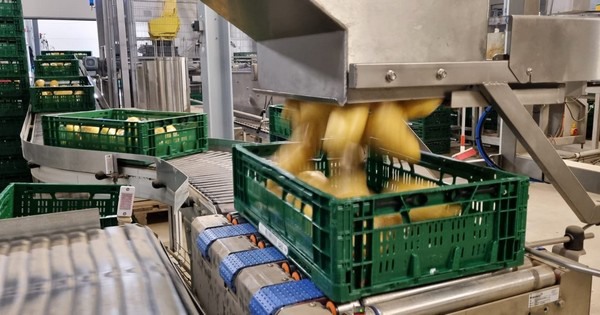 Moespom cuenta con una opción extra: llenar las cajas plegables de patatas sueltas inmediatamente después de desplegarlas. Una vez llenas, las cajas se transportan directamente a la paletizadora Lan Handling. Las cajas plegables se pueden colocar en dos tamaños de palés diferentes: palé europeo y palé americano. De esta manera, se hace un uso óptimo de la línea de suministro de cajas ya existente.