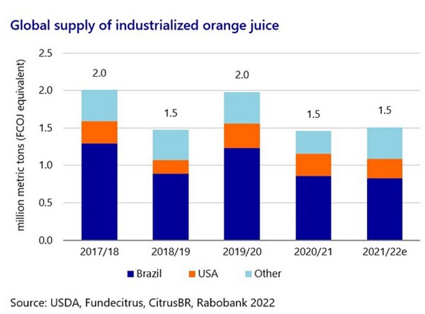 El mercado mundial del zumo de naranja tiene los niveles de inventario más bajos del último quinquenio, al disminuir la producción de Brasil y Florida. En épocas normales, esto habría hecho subir los precios de manera constante. Sin embargo, los vientos en contra que afectan a la demanda a largo plazo y una posible leve recuperación de la producción brasileña en 2022/23 podrían limitar las subidas de precio este año.