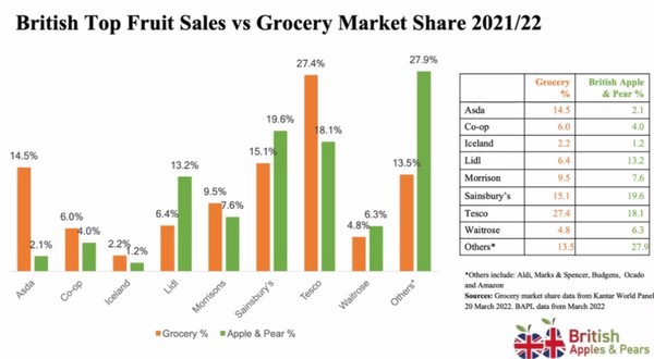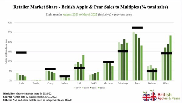 Los retailers contribuyen eficientemente a la venta de manzanas británicas, con Lidl y Sainsbury's a la cabeza. En la columna "otros", Aldi es uno de los mayores, junto con Marks & Spencer. Por otro lado, Asda y Tesco podrían hacer las cosas mejor.