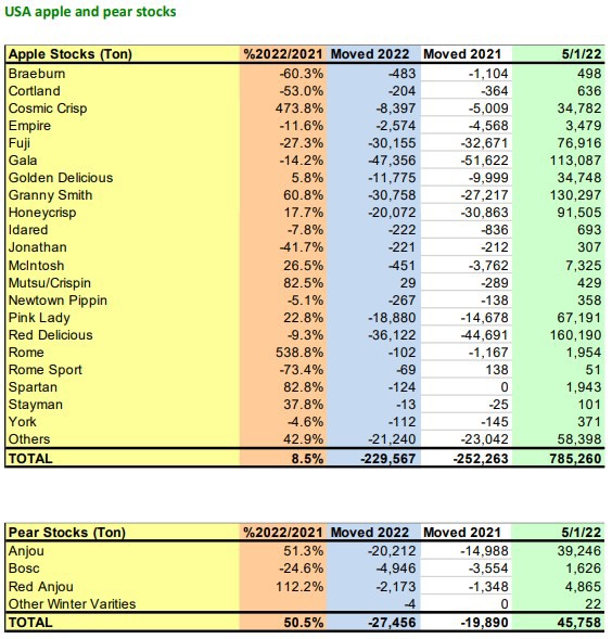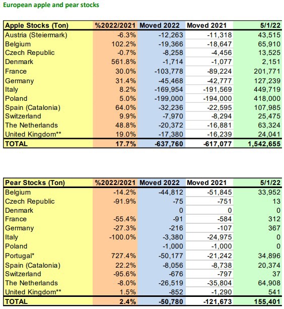 WAPA, la Asociación Mundial de Manzana y Pera, ha publicado las existencias de manzanas y peras del 1 de mayo de 2022. Las cifras muestran que, en Europa, las existencias de manzanas han crecido un 17,7% en comparación con 2021 hasta situarse en 1.542.655 t, mientras que las de peras han aumentado un 2,4% a 155.401 toneladas. En Estados Unidos, las existencias de manzanas hasta el 1 de mayo ascendieron a 785.260 t (+8,5% en comparación con 2021), mientras que las de peras alcanzaron 45.758 toneladas (un 50,5% por encima de 2021). WAPA continuará publicando las existencias mensualmente en su sitio web y redes sociales el resto de la temporada.
