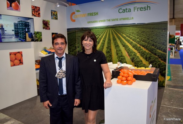 Sergio Orobal, gerente de Catman Fresh, junto a su compañera del departamento comercial, María C. García, en la Fruit Attraction de 2021.